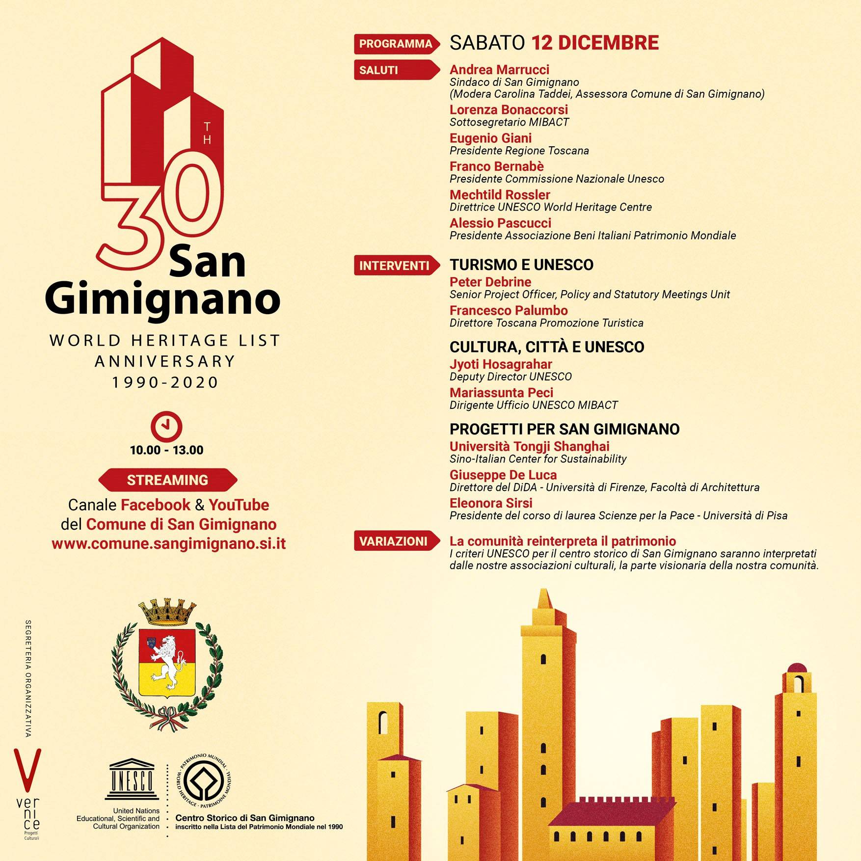 La tutela e la valorizzazione di un Patrimonio dell’Umanità ed il rilancio di turismo e cultura post pandemia. San Gimignano celebra i suoi 30 anni nella lista del Patrimonio Mondiale dell’Unesco con uno sguardo al futuro che possa permettere di ripensare i criteri di sviluppo e i valori fondanti della comunità, colpiti anch’essi duramente dal coronavirus. Sabato 12 dicembre dalle ore 10 un evento on line nella pagina Facebook e nel profilo youtube del Comune di San Gimignano che vedrà protagonisti rappresentanti del Mibact, della Regione Toscana, dell’Unesco oltre a docenti universitari italiani e stranieri ed esperti del settore turistico e culturale e coinvolgendo tutta la comunità di San Gimignano.