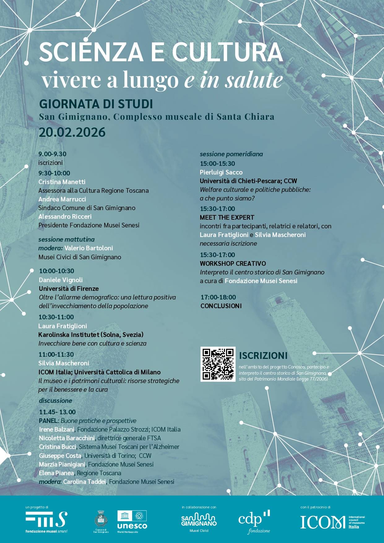 Avrà luogo il 20 febbraio 2026 presso il Complesso museale di Santa Chiara a San Gimignano la giornata di studi Scienza e Cultura. Vivere a lungo e in salute, organizzata dalla Fondazione Musei Senesi con il Comune di San Gimignano, i Musei Civici e la Fondazione Cassa Depositi e Prestiti.